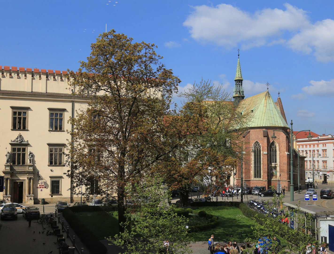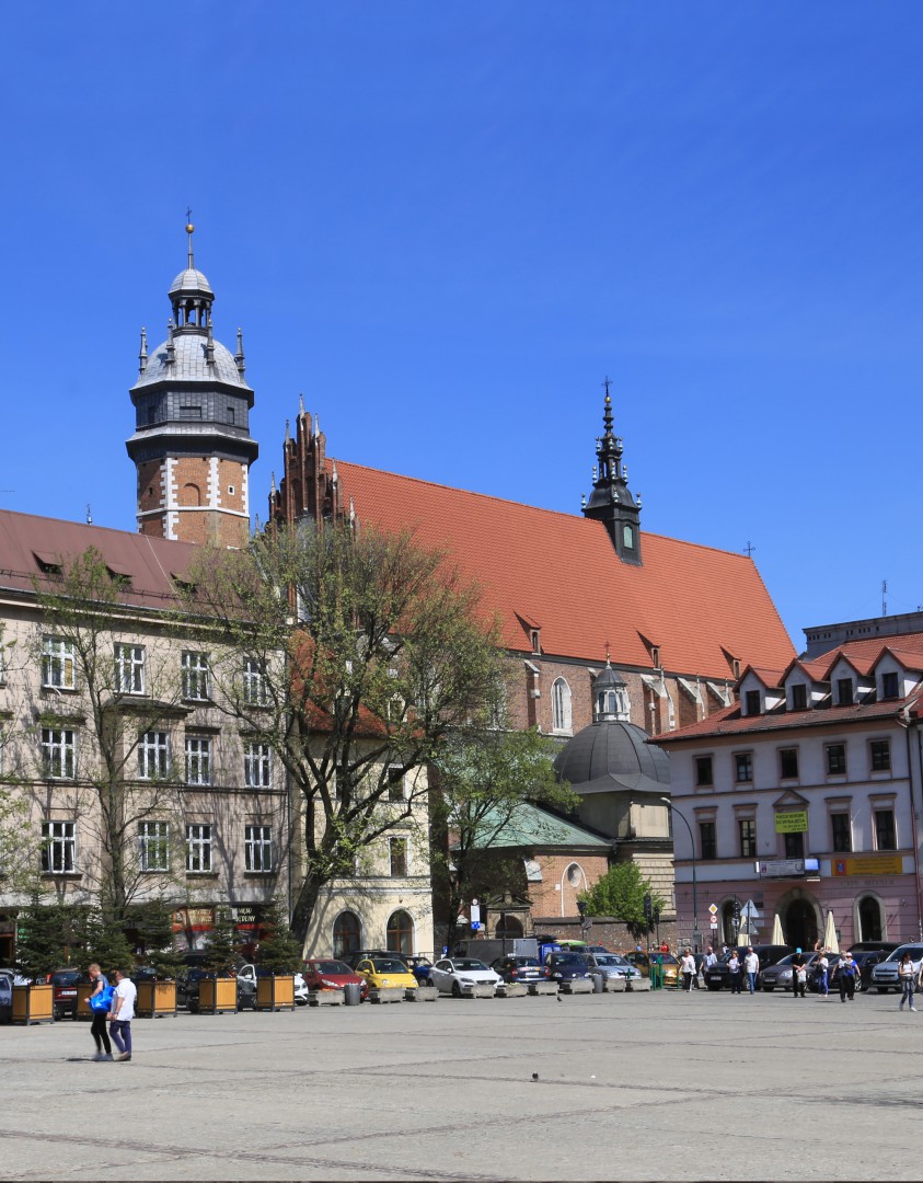 Na uwagę zasługuje widoczny przed kościołem przystanek tramwajowy. Tramwaje na Rynku kursowały przez równe 70 lat, począwszy od 1882 r. Linia tramwajowa biegła spod dworca kolejowego, przez Rynek, do ul. Mostowej na Kazimierzu. Ostatni tramwaj przejechał przez Rynek 27 czerwca 1952 r.