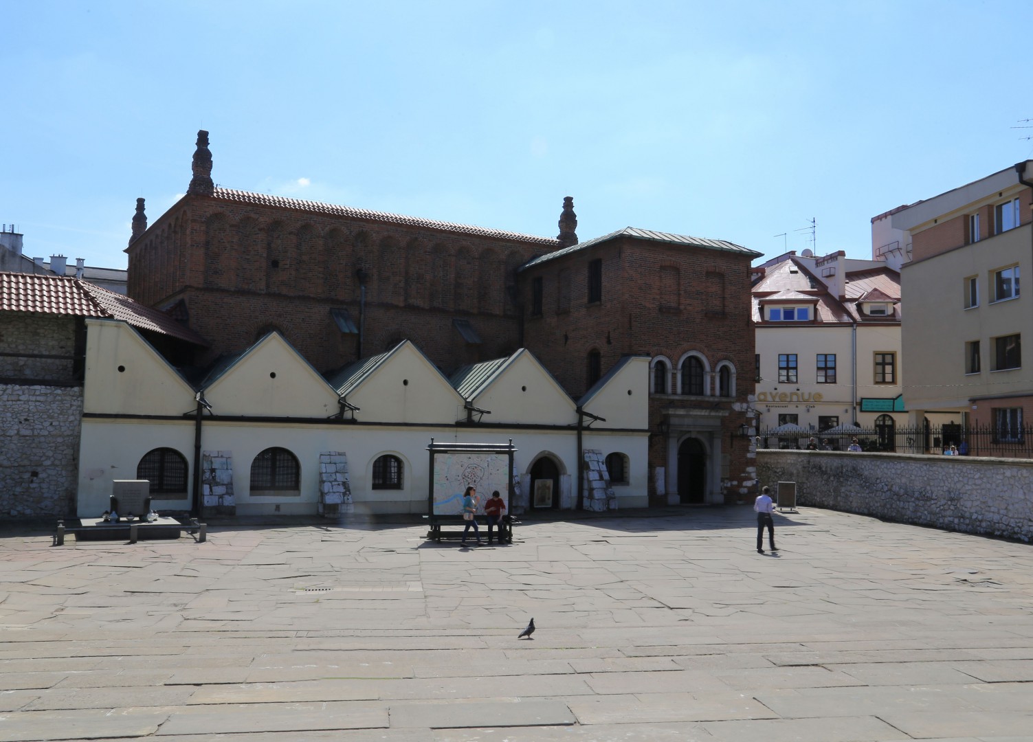 Widoczna na zdjęciu bóżnica jest najstarszą z zachowanych synagog w Polsce, a zarazem jednym z najcenniejszych zabytków żydowskiej architektury sakralnej w Europie. Wybudowana w XV w. w stylu gotyckim przez czeskich Żydów, przybyłych w 1389 r. do Krakowa. Po pożarze w 1557 r. została przebudowana przez Matteo Gucciego, który wzbogacił gotycką budowlę pierwiastkami renesansowymi. W czasie II wojny światowej zrujnowana, odrestaurowana z przeznaczeniem na muzeum. Obecnie mieści się w niej oddział Muzeum Historycznego Miasta Krakowa, w którym prezentowana jest wystawa dotycząca kultury żydowskiej, ze szczególnym uwzględnieniem tradycji Żydów krakowskich.