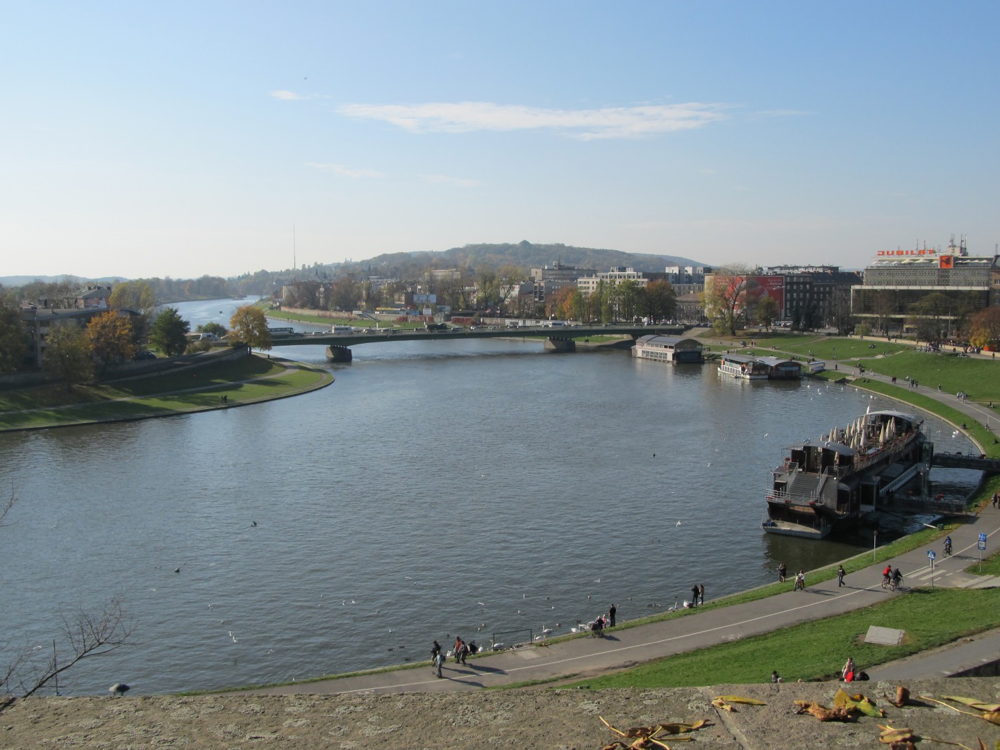 W kadrze po lewej stronie Krieger utrwalił Półwsie Zwierzynieckie. Zwraca uwagę rzadka i niska zabudowa i górujący dwukondygnacyjny Dwór Łowczego. W oddali majaczą Bielany, klasztor Norbertanek i kopiec Kościuszki. Uwagę zwraca nieład panujący u stóp Wzgórza Wawelskiego – widoczne tu składy drewna i opału usunięto dopiero w latach 80-tych XIX w.