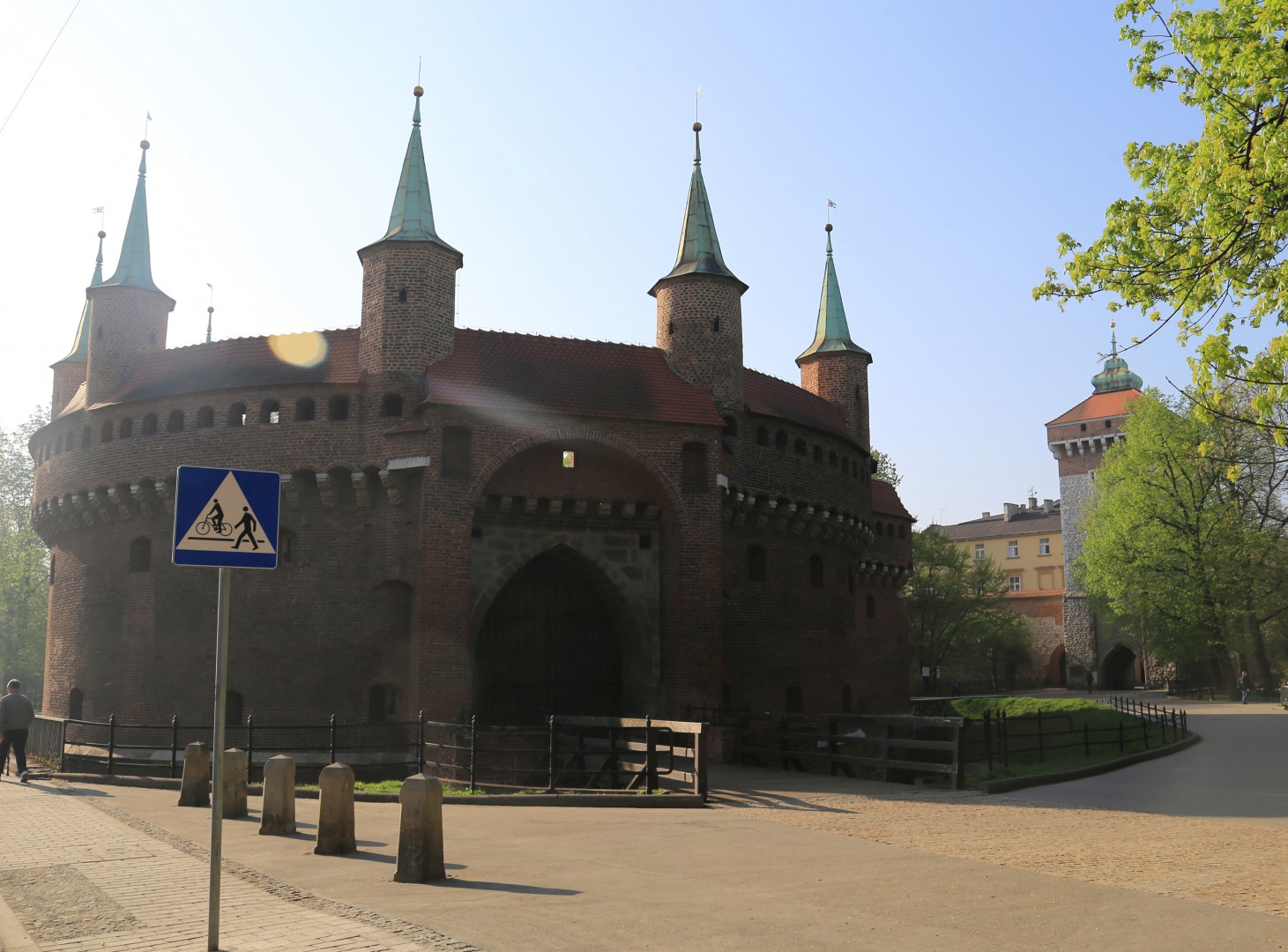 Barbakan, który niegdyś strzegł głównego wjazdu do Krakowa od strony północnej, to budowla otwarta od góry i zwieńczona siedmioma wieżyczkami obserwacyjnymi. Posiada szereg otworów strzelniczych dla artylerii, kuszników i strzelców broni palnej. Wzniesiono go z cegły w latach 1498-1499 przy dużym wkładzie króla Jana Olbrachta. Wielokrotnie restaurowany. Po 1806 r. mury obronne w większości zburzono, a w latach 20. XIX w. na ich miejscu założono Planty.