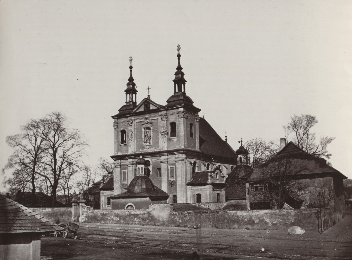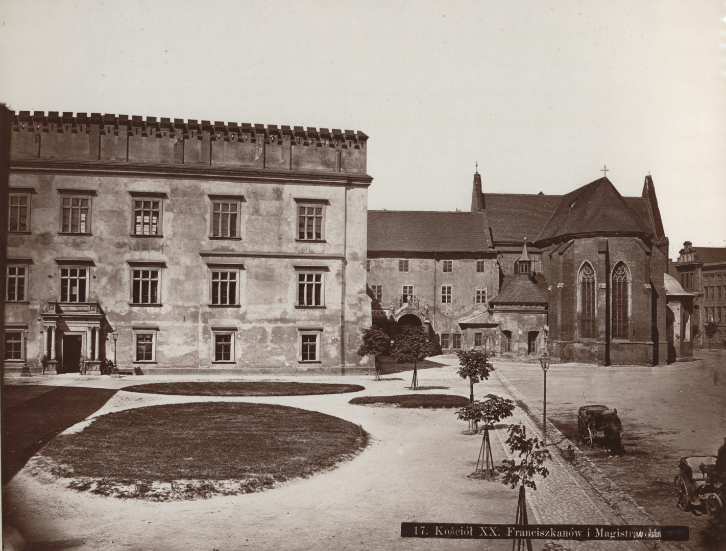 Na dziewiętnastowiecznym zdjęciu widoczny jest zespół klasztorny oo. Franciszkanów, prawdopodobnie fundacji księcia Henryka Pobożnego. Od początku zbudowany na planie krzyża łacińskiego na wzór kościoła św. Franciszka w Vitebro. Kościół początkowo wzniesiony w stylu romańskim, później przekształcony został na gotycki. W swojej długoletniej historii kościół i klasztor był wielokrotnie przebudowywany i rozbudowywany. Zmiany te wynikały z kilku wielkich pożarów, które dotknęły zabudowania klasztorne.
