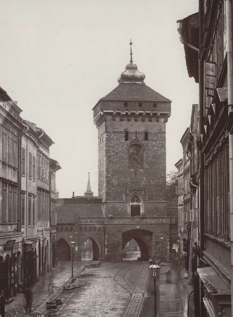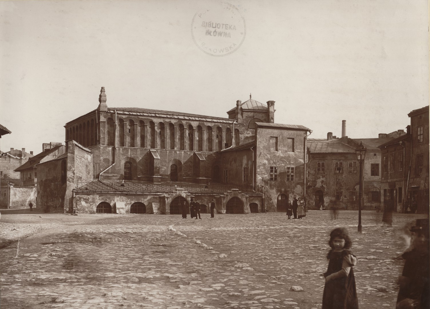 Brakującą na zdjęciu Ignacego Kriegera wieżę, spaloną w pożarze z 1850 r. wykonano pod koniec XIX w. według projektu architekta Karola Knausa. Po lewej stronie stoi okazały budynek, Pałac Wielopolskich. Wzniesiony został w pierwszej połowie XVI w., a później wielokrotnie przebudowywany.