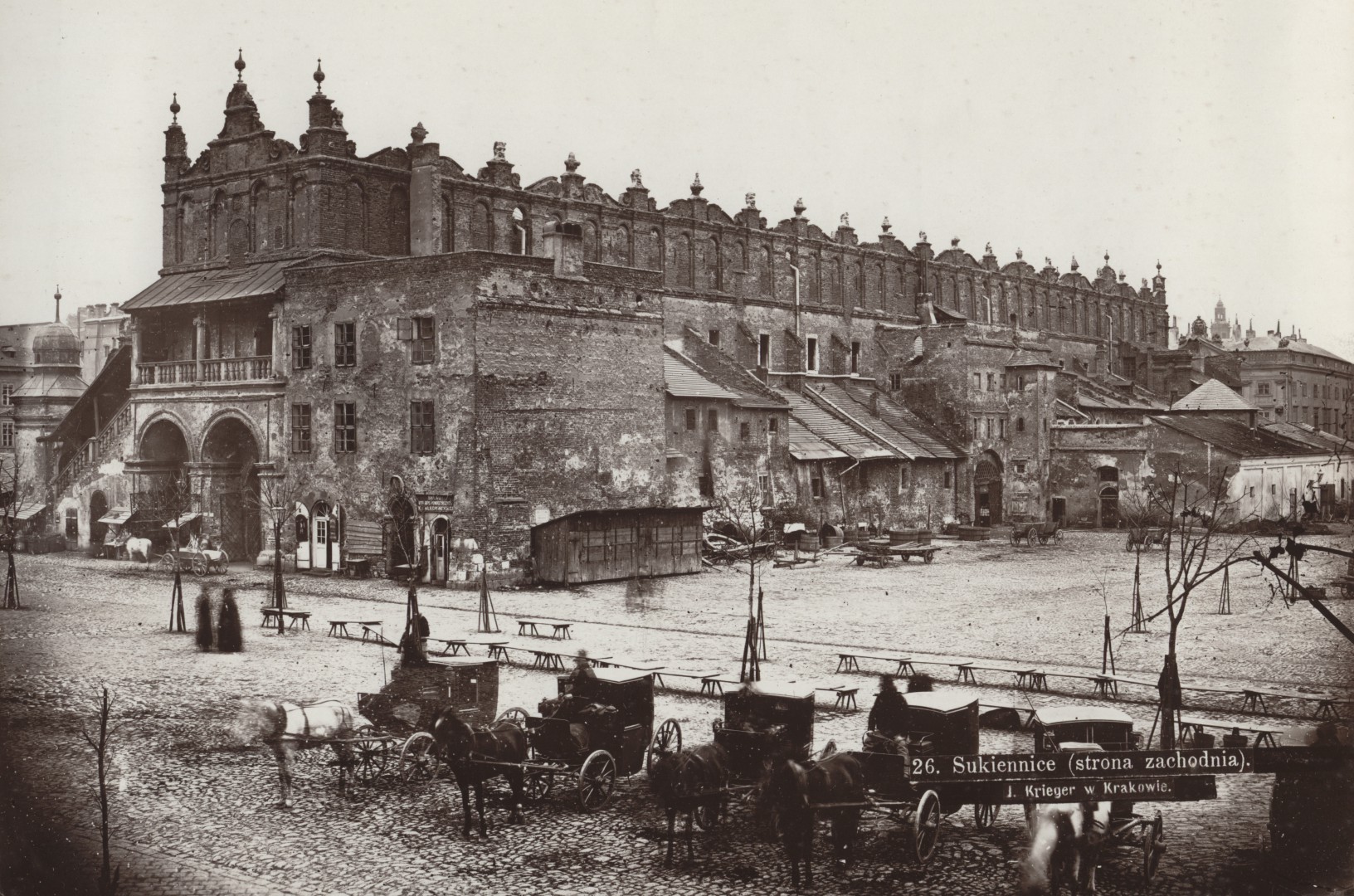 Zdjęcie Ignacego Kriegera sprzed 1875 r. przedstawia Sukiennice od strony zachodniej, na którym utrwalił szereg przybudówek. W dwóch kamienicach mieściły się postrzygalnie (pomieszczenia urzędu pomiaru i wyceny sukna), po lewej tzw. Syndykówka, na środku Sukiennic Langierówka. Widzimy również kramy rybne i piekarskie oraz hale jatek szewskich i czerwonych garbarzy.