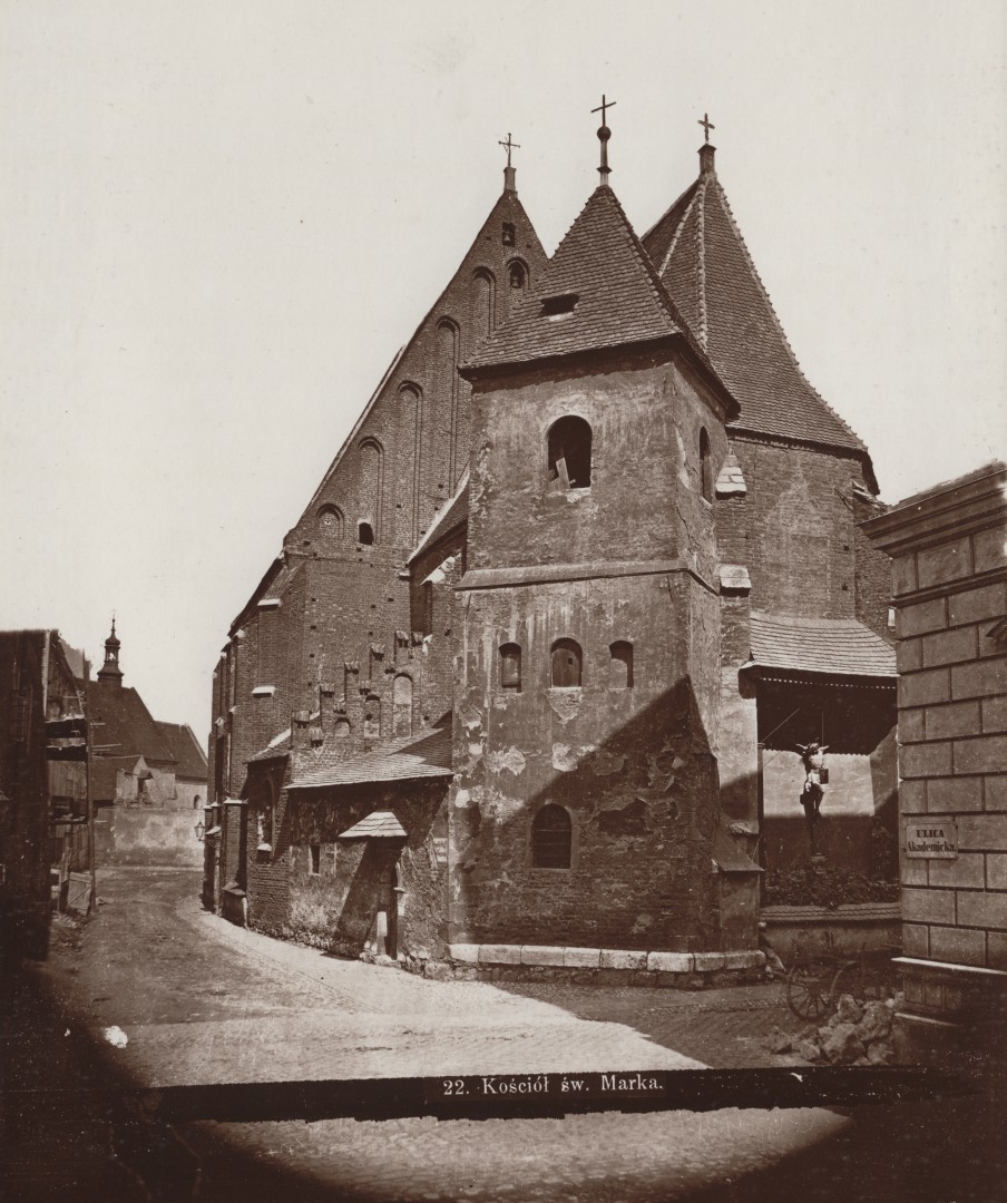 „Przy ulicy Sławkowskiej wznoszą się stare mury z gotyckiemi wnękami, na murach przybity olbrzymi krzyż z rozpiętym Zbawicielem, przed krzyżem płonie latarnia –to kościół św. Marka”