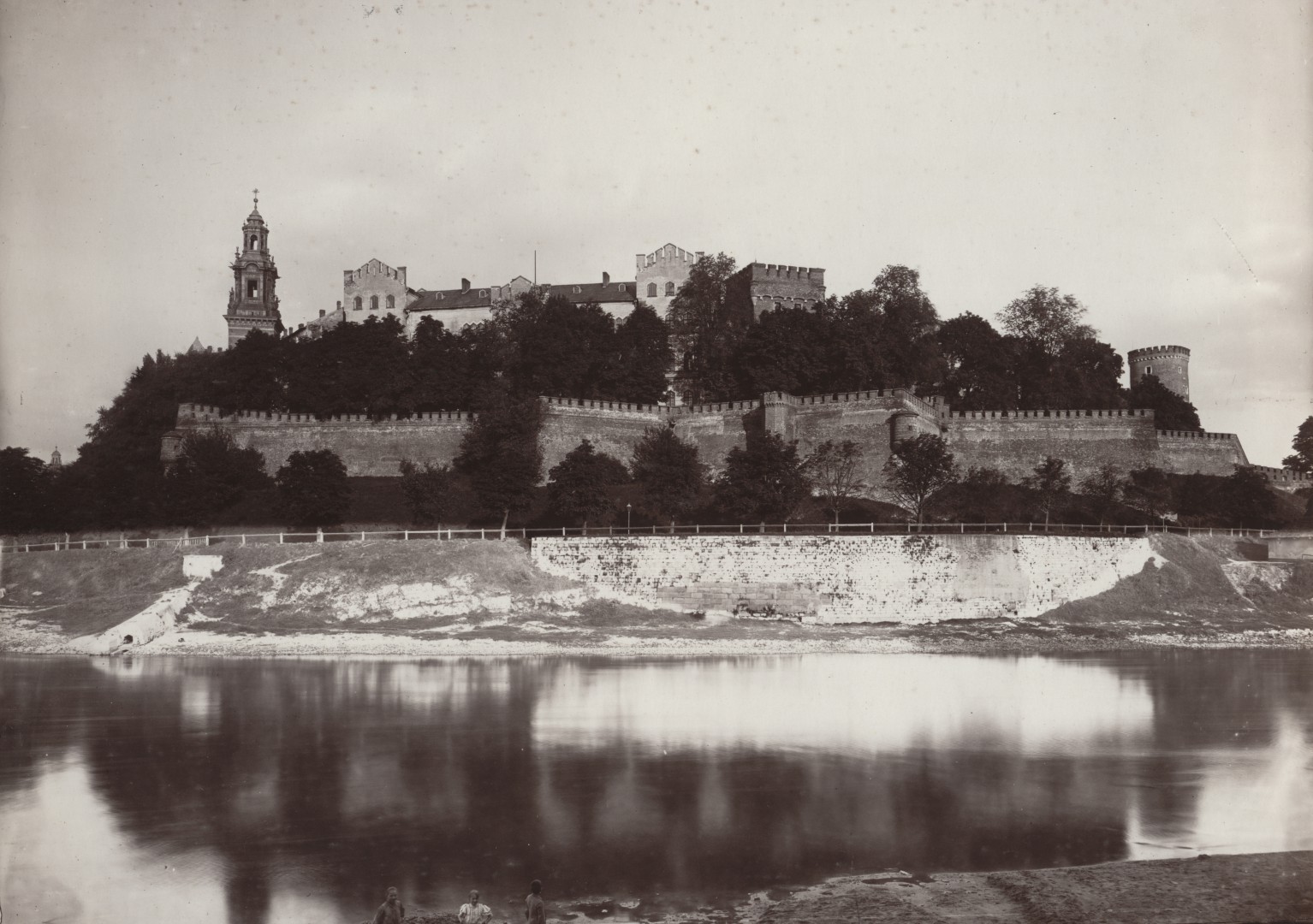 Fotografia z ok. 1890 r. to widok Wawelu z prawego brzegu Wisły, od strony zachodniej. Wzgórze Wawelskie przecina austriacki mur obronny, za nim widoczny jest fragment zamku z wieżą Zygmuntowską (po lewej), Basztą Złodziejską (w środku) oraz Basztą Sandomierską (po prawej).