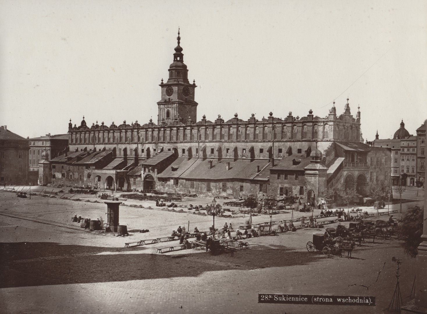 Fotografia to ujęcie Sukiennic od strony wschodniej, na którym widzimy murowane Kramy Bogate, w których handlowano towarami luksusowymi. Na zdjęciu brakuje pomnika Adama Mickiewicza najbardziej rozpoznawalnego i najczęściej fotografowanego pomnika Krakowa, odsłoniętego w 1898 r.